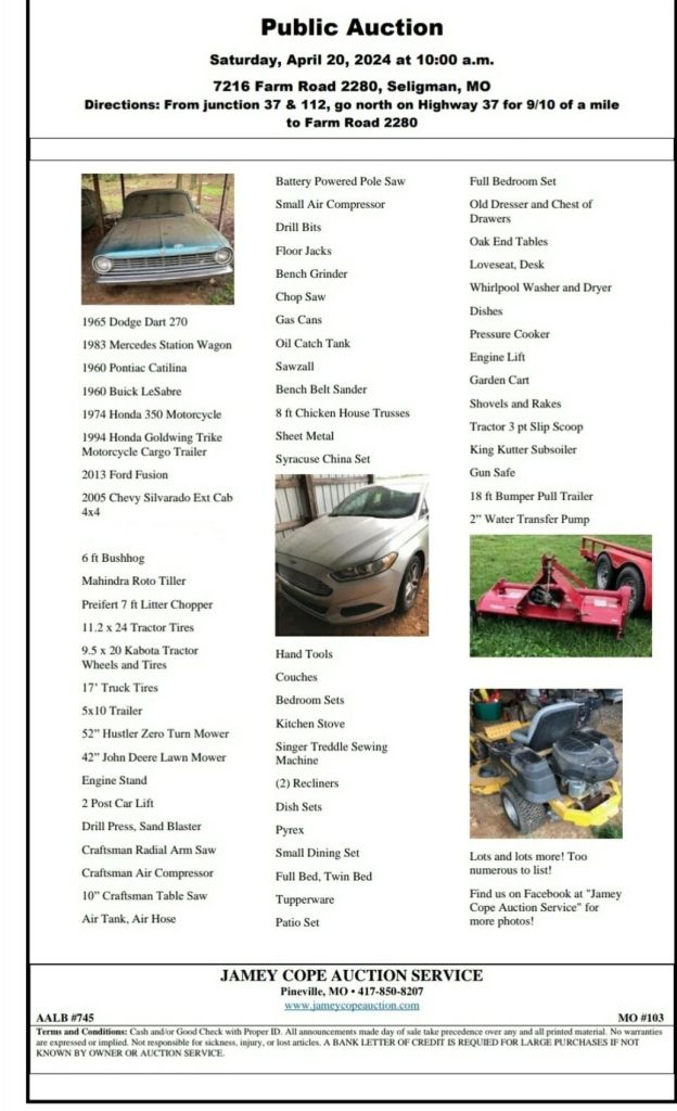 Public AuctionSaturday, April 20, 20247216 Farm Road 2280, Seligman, MO