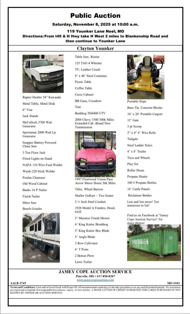 Public AuctionSaturday, November 8, 2025 at 10:00 a.m.119 Younker Lane Noel, MO